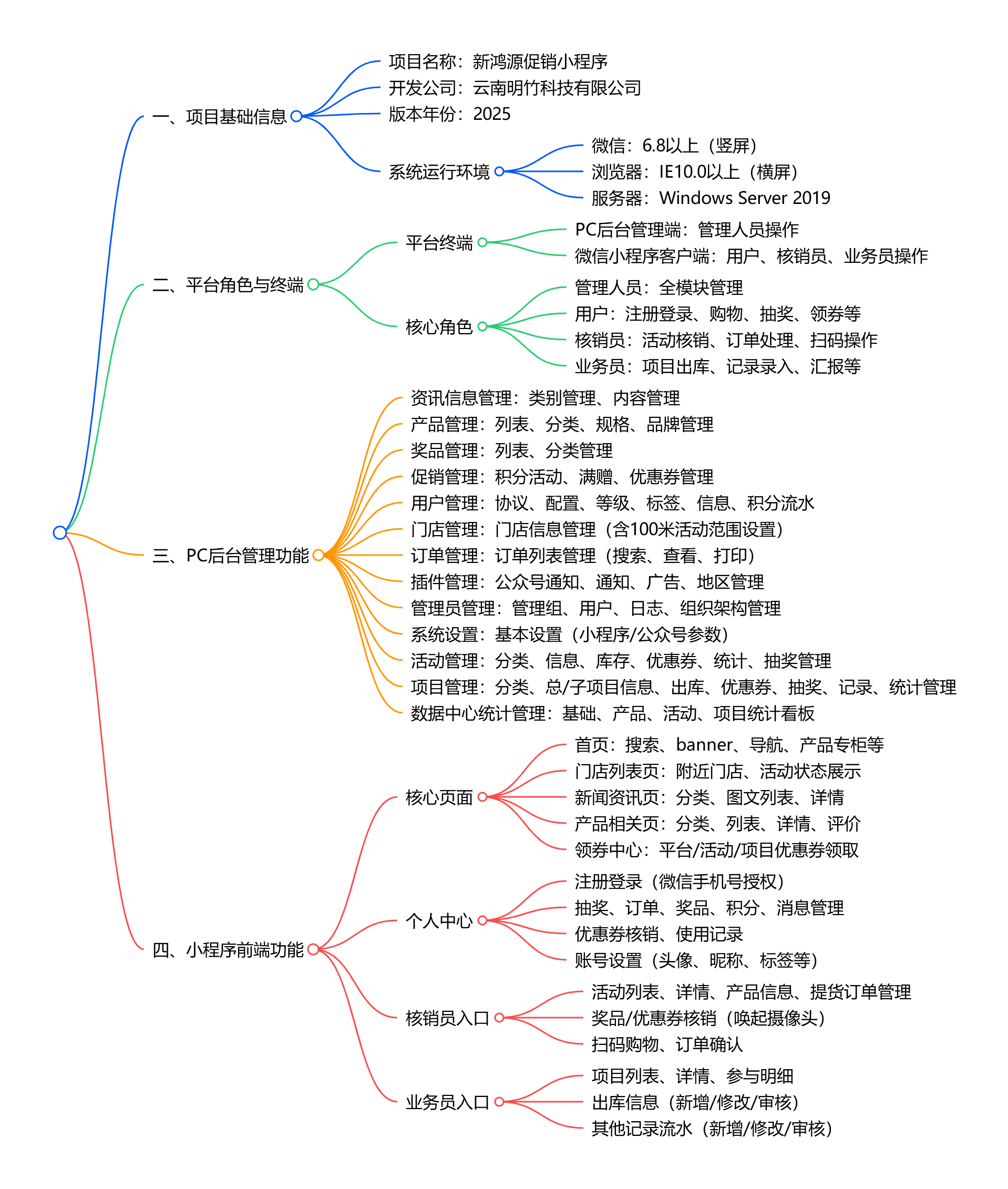 1. 一段话总结《促销小程序 2025 功能方案》明确了由云南明竹科技有限公司开发的小程序核心架构,包含PC 后台管理端与微信小程序客户端,覆盖管理人员、用户、核销员、业务员四类角色,核心功能涵盖资讯 / 产品 / 奖品 / 促销 / 用户 / 门店 / 订单 / 活动 / 项目等多模块管理,以及小程序前端首页、门店、产品、个人中心等场景化操作,支持积分兑换、满赠、抽奖、优惠券核销等促销玩法,系统需适配微信 6.8+、IE10.0 + 浏览器。